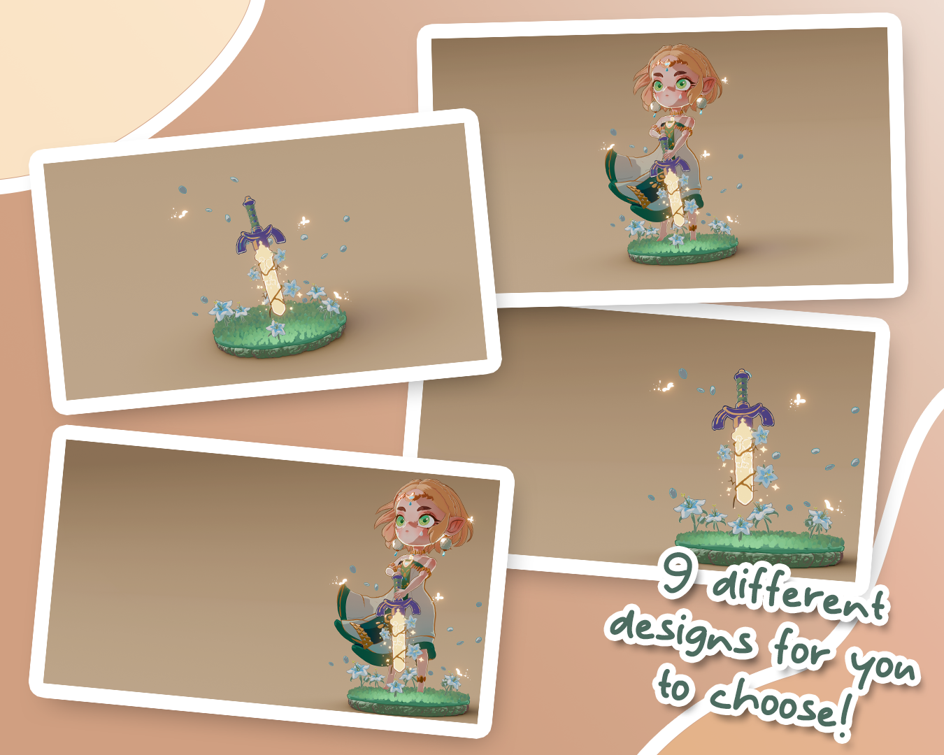 You get two different designs: one with Zelda in the whole composition, and other with just the Master Sword. Both of them have different camera angles and locations.